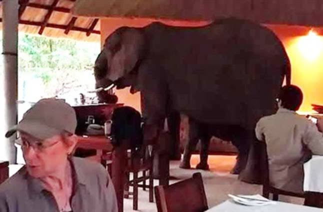 عاش مجموعة من السياح دقائق من الرعب، عندما اقتحمت أفيال قاعة طعام خارجية كانوا يتناولون فيها فطورهم في زامبيا، إذ اضطروا للبقاء جالسين في مقاعدهم دون أي حركة في انتظار رحيل الضيوف غير المرغوب بهم. وكان سياح أميركيون يتناولون فطورهم، عندما دخل فجأة فيل ضخم إلى قاعة الطعام الموجودة في الهواء الطلق، يتبعه فيل آخر صغير، بحثا عن الطعام.