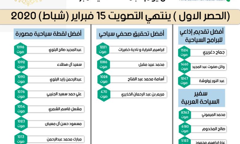 كشف المركز العربي للاعلام السياحي عن ارقام الأسبوع الأول والثانى للتصويت فى مسابقة جوائز الاعلام السياحي العربي لعام 2020 عن فئات " أفضل تقديم إذاعى للبرامج السياحية ".. "أفضل تحقيق صحفى سياحى".."أفضل لقطة مصورة "..سفير السياحة العربية".. وذلك حتى يوم 27 ديسمبر الجاري وسوف يعلن المركزعن الارقام كل أسبوعين يوم السبت ويستمر التصويت حتى يوم 15 فبراير 2020.