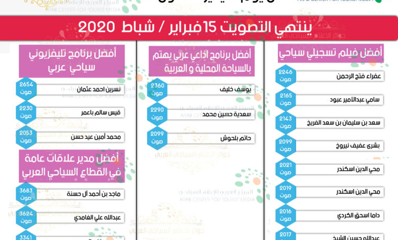 أعلنت لجنة جوائز الإعلام السياحي العربي في دورتها 12 "البيان الثاني" بأرقام المتنافسين في كافة فئات مسابقة الإعلام السياحي العربي لعام 2020 حتى يوم السبت الموافق 11 يناير / كانون ثاني 2020 ووفق ما أعلنته لجنة الإشراف فان نهاية المسابقة والتصويت سيكون في 15 فبراير / شباط 2020.