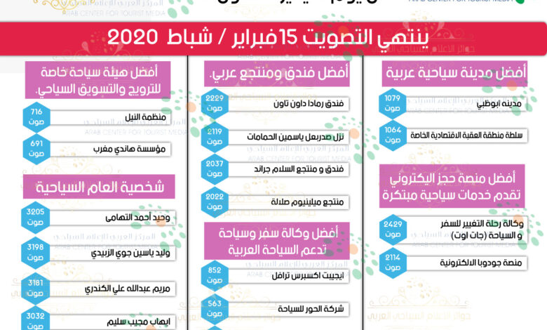 أعلنت لجنة جوائز الإعلام السياحي العربي في دورتها 12 "البيان الثاني" بأرقام المتنافسين في كافة فئات مسابقة الإعلام السياحي العربي لعام 2020 حتى يوم السبت الموافق 11 يناير / كانون ثاني 2020 ووفق ما أعلنته لجنة الإشراف فان نهاية المسابقة والتصويت سيكون في 15 فبراير / شباط 2020.