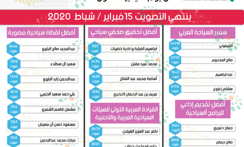 أعلنت لجنة جوائز الإعلام السياحي العربي في دورتها 12 "البيان الثاني" بأرقام المتنافسين في  كافة فئات مسابقة الإعلام السياحي العربي لعام 2020 حتى يوم السبت الموافق 11 يناير / كانون ثاني 2020 ووفق ما أعلنته لجنة الإشراف فان نهاية المسابقة والتصويت سيكون في 15 فبراير / شباط 2020.