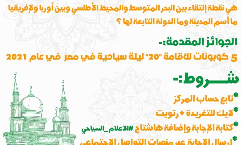 أطلق المركز العربي للإعلام السياحي المسابقة الرمضانية السنوية وللعام الثاني على التوالي . تتضمن المسابقة "15"سؤال طوال شهر رمضان وهي مسار الرحالة العربي ابن بطوطة وترسل الإجابة من خلال موقع من منصات التواصل الخاصة بالمركز ويشترط للفوز بجوائز المسابقة تأكيد متابعة الفائز لحساب المركز .. وعمل لايك ورتويت .. وكتابة الإجابة وإضافة هاشتاج المركز العربي للإعلام السياحي .. والجوائز ستكون 5 كوبونات إقامة 20 ليلة سياحية في مصر خلال 2021..