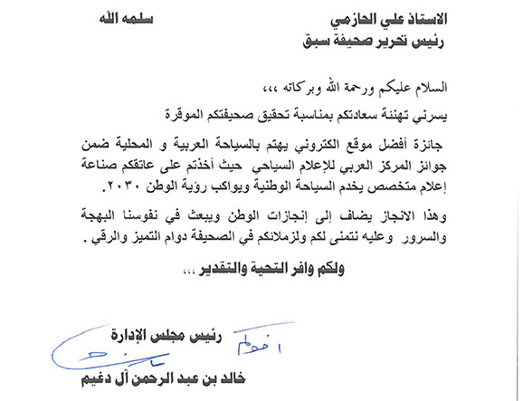 أرسل الأستاذ خالد آل دغيم رئيس مجلس إدارة جمعية الإعلام السياحي ببرقية تهنئة إلي سعادة الاستاذ علي الحازمي رئيس تحرير صحيفة "سبق " الالكترونية لفوزها بالمركز الأول على جميع الصحف والمواقع الإخبارية العربية في جوائز الإعلام السياحي السنوية، وفي فئة التغطيات الإخبارية للسياحة المحلية والعربية.