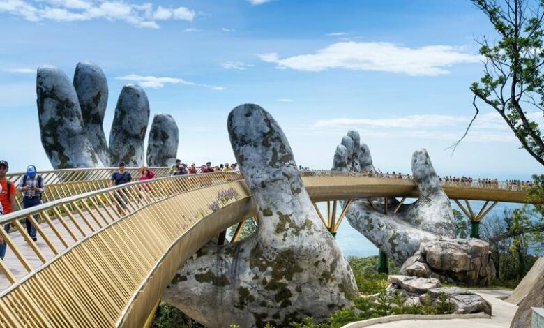 الجسر الذهبي .. في تلال "بانا"، بالقرب من "دا نانغ" .. أصبح نقطة جذب سياحي وأحد أشهر المعالم السياحية والحيوية في فيتنام .. يعتبر رمزاً من رموز السياحة في مدينة دا نانغ .. يُعدّ المقصد الأول للكثير من السياح والمغامرين من مختلف أرجاء العالم، ويتمتّع جسر المشاة الشهير بصيت واسع وشعبية كبيرة بين السياح والمحليين على حد سواء، وذلك نظراً لشكله الفريد وموقعه الاستثنائي، حيث تحمله أيدي حجرية عملاقة ومنحوتة بدقة عالية، كما يُوفّر إطلالة ساحرة على امتداد 150 متر من القمم الجبلية المُحيطة به والوديان العميقة الواقعة أسفله.