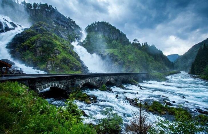 الجسر القديم فوق شلال ليت فوسن Låtefossen في النرويج
