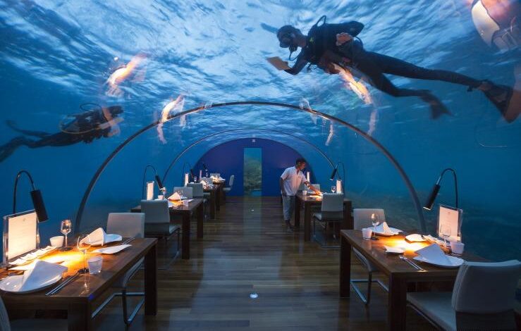 يشكل مطعم إيثا الزجاجي أول مطعم تحت الماء في المالديف فرصة لاستكشاف الحياة المائية بأبهى حلتها ولمشاهدة أسماك القرش والسلاحف المائية وأسماك الراي والشعاب المرجانية الرائعة من خلال المناظر البانورامية الخلابة التي يوفرها.