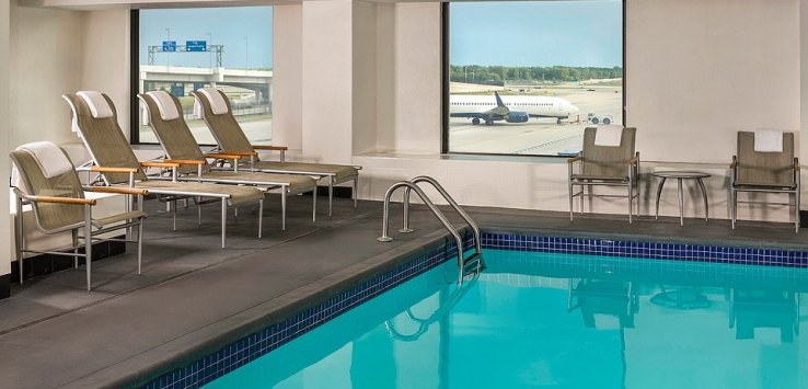يقع المسبح في الطابق الثاني بجانب الجيم ، ويفتتح يوميًا من الساعة 6 صباحًا حتى الساعة 11 مساءً ، ويتم توفير المناشف وجميع مرافق اللياقة البدنية لضيوف المطار مقابل رسوم 15 دولارًا .